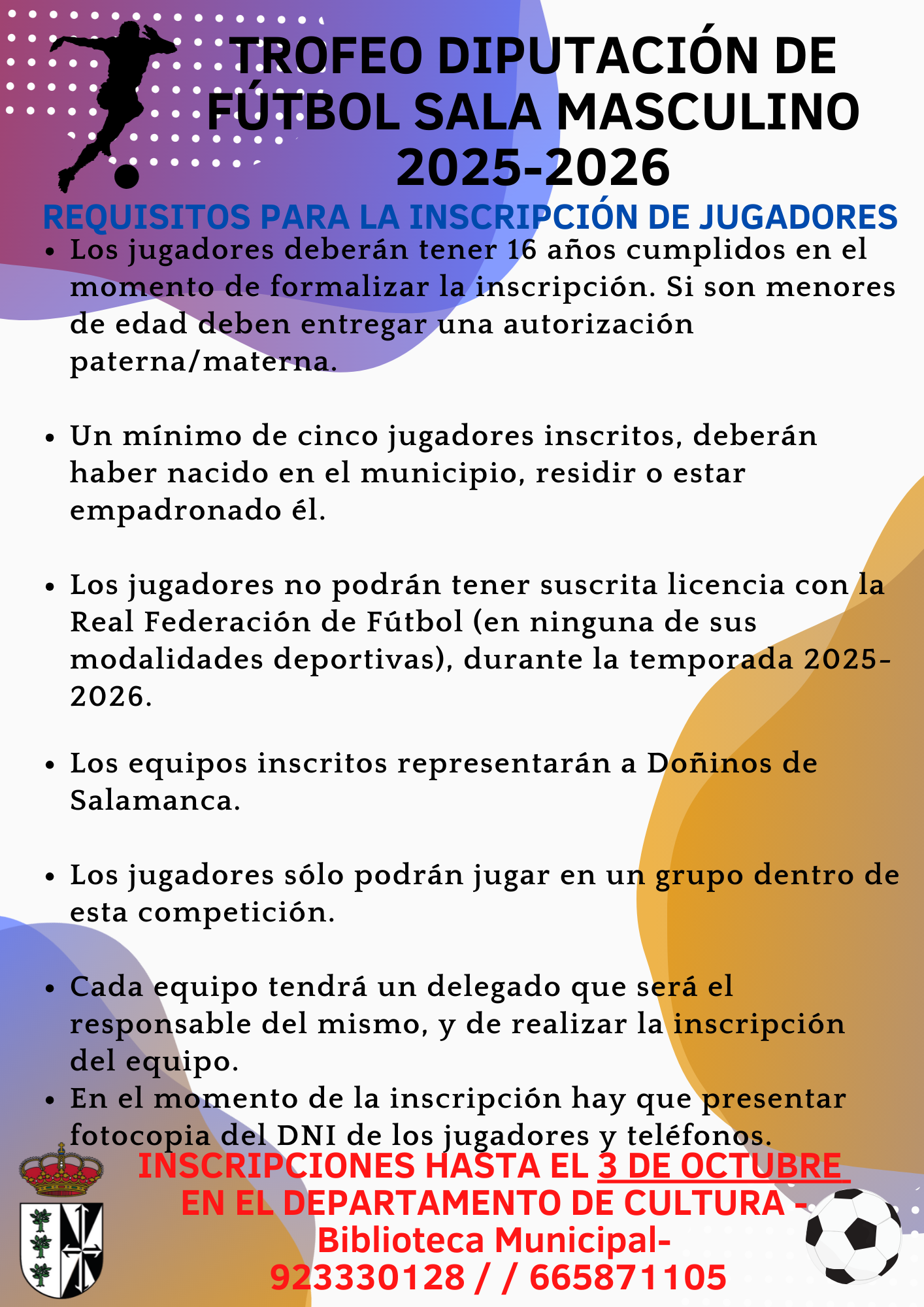 Noticias culturaNoticias deporte TROFEO DE DIPUTACIÓN DE FÚTBOL SALA MASCULINO 2025-2026 Hace 4 semanas Nueva convocatoria deportiva de Diputación de Salamanca.Si estás interesado en participar como equipo acude al Departamento de Cultura antes del 3 de octubre.