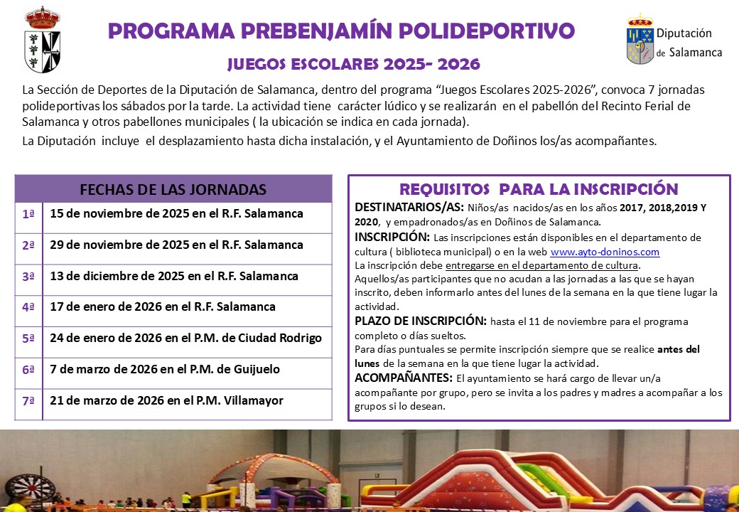 Noticias culturaNoticias deporte PROGRAMA POLIDEPORTIVO PREBENJAMÍN Hace 4 semanas Nueva convocatoria del Programa Prebenjamín Polideportivo de juegos escolares de la Diputación de Salamanca para niños/as nacidos en 2017,2018,2019 y 2020.Toda la información en nuestra web municipal:https://ayto-doninos.com/detalle-informacion/PROGRAMA-PREBENJAMIN-POLIDEPORTIVO-00001/